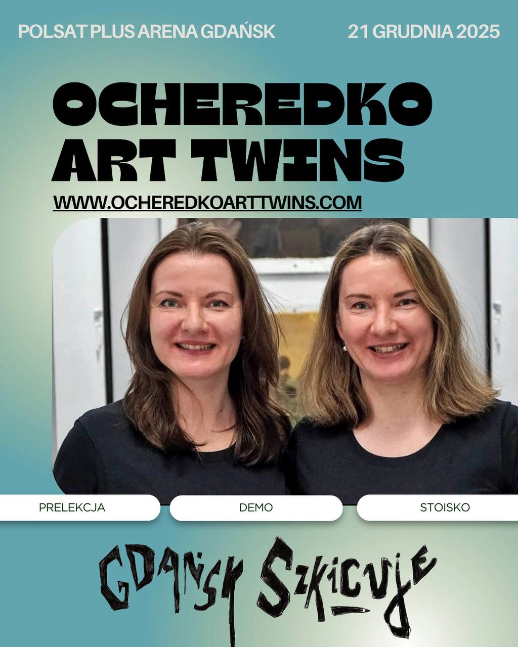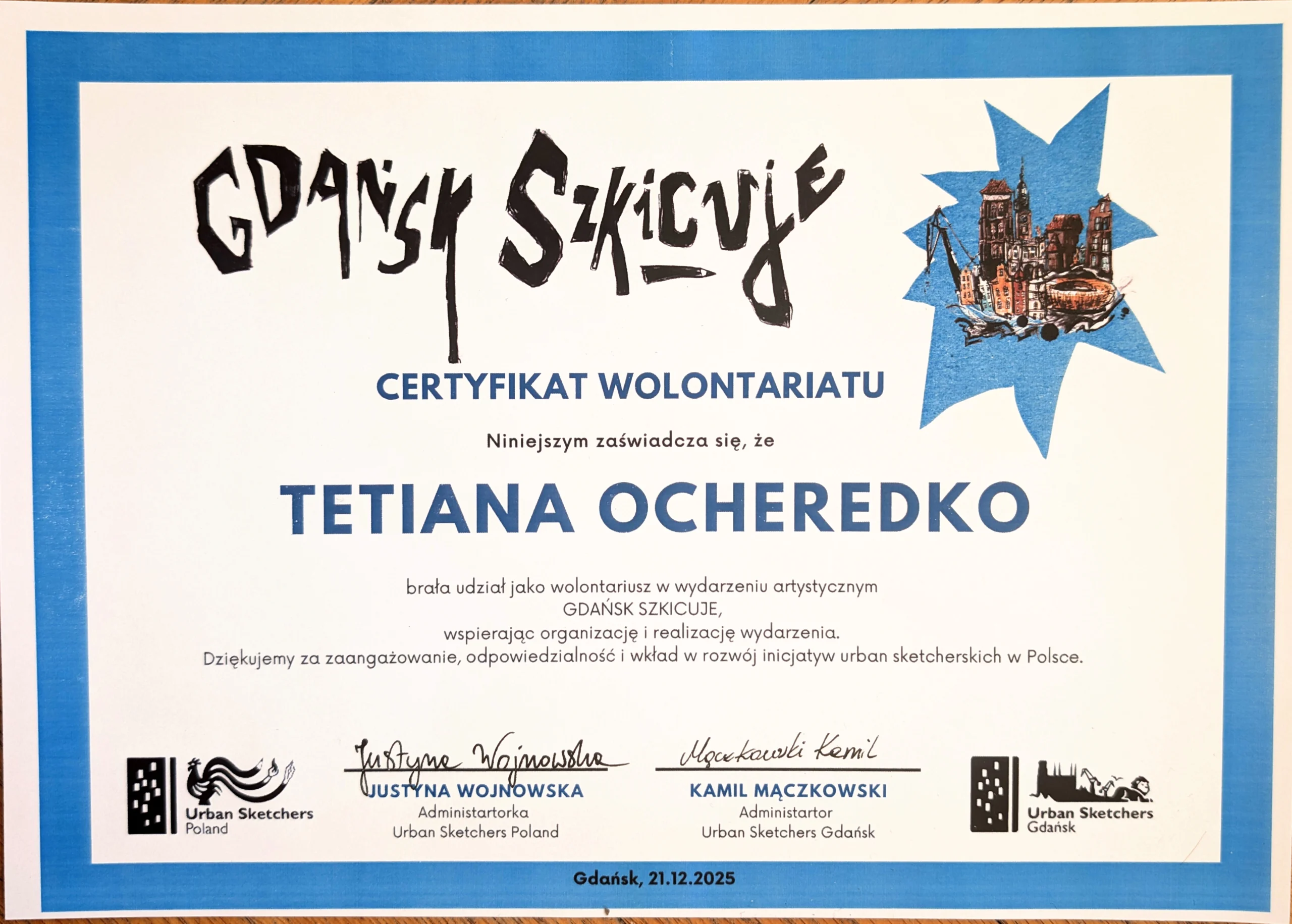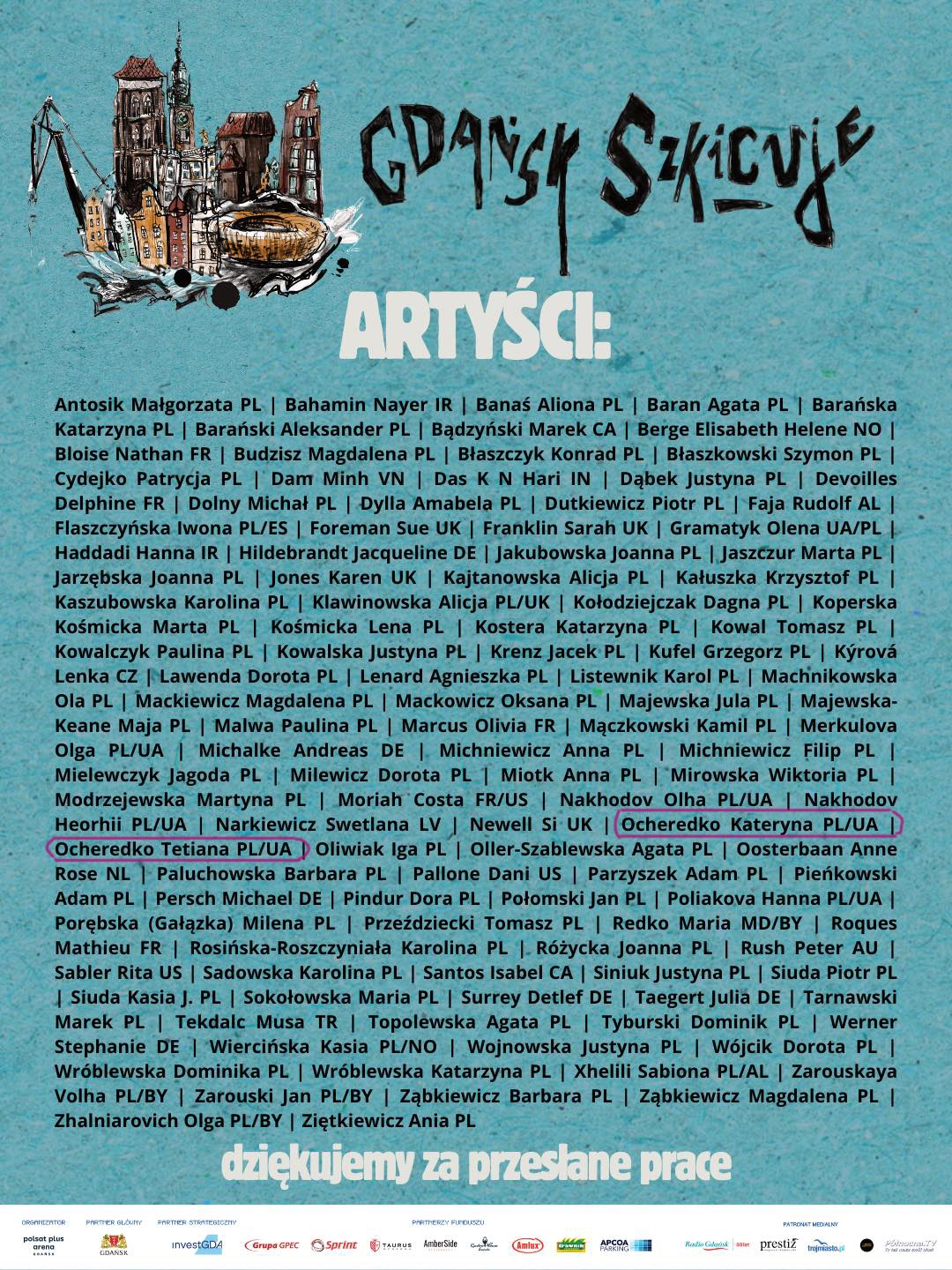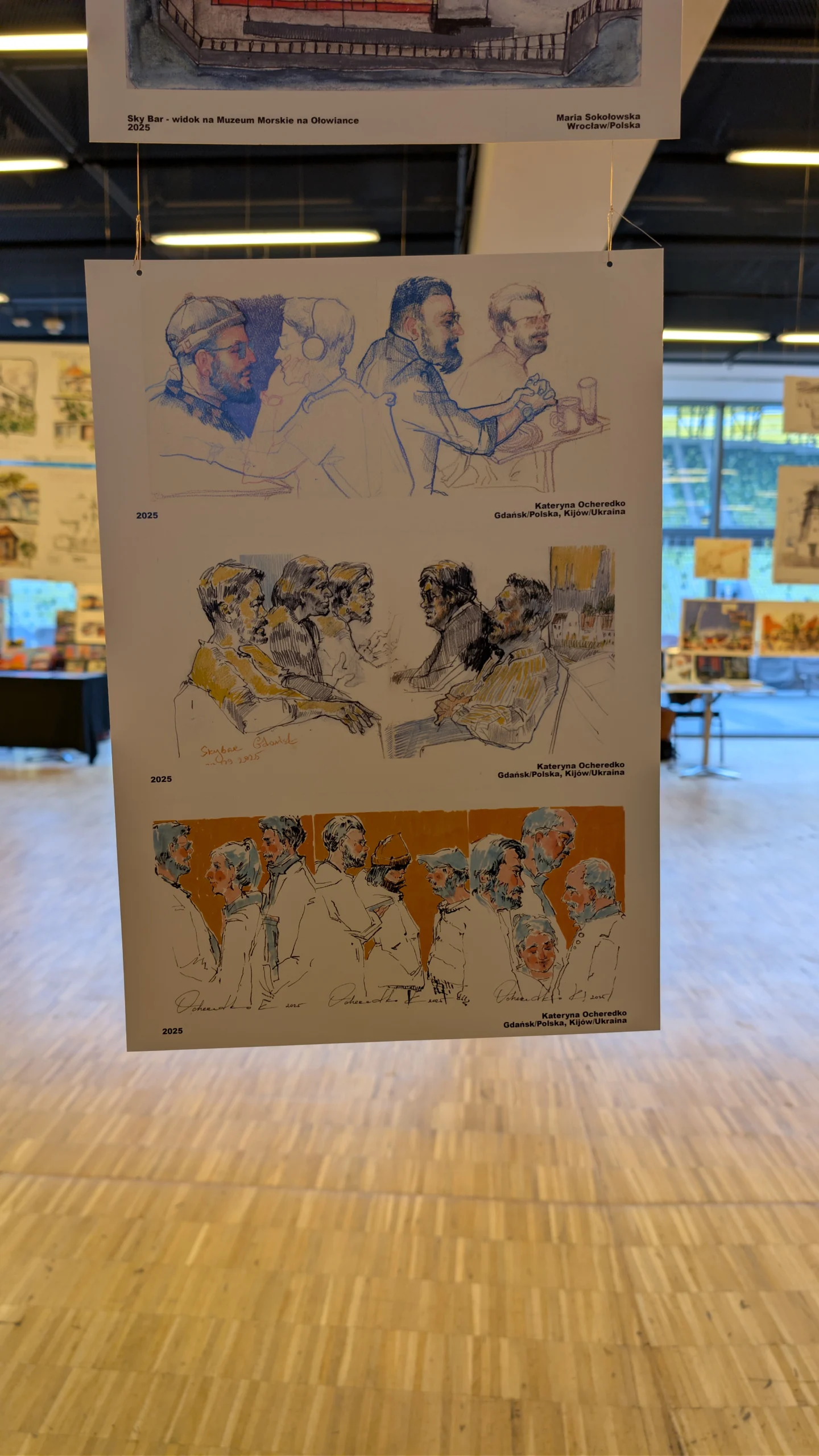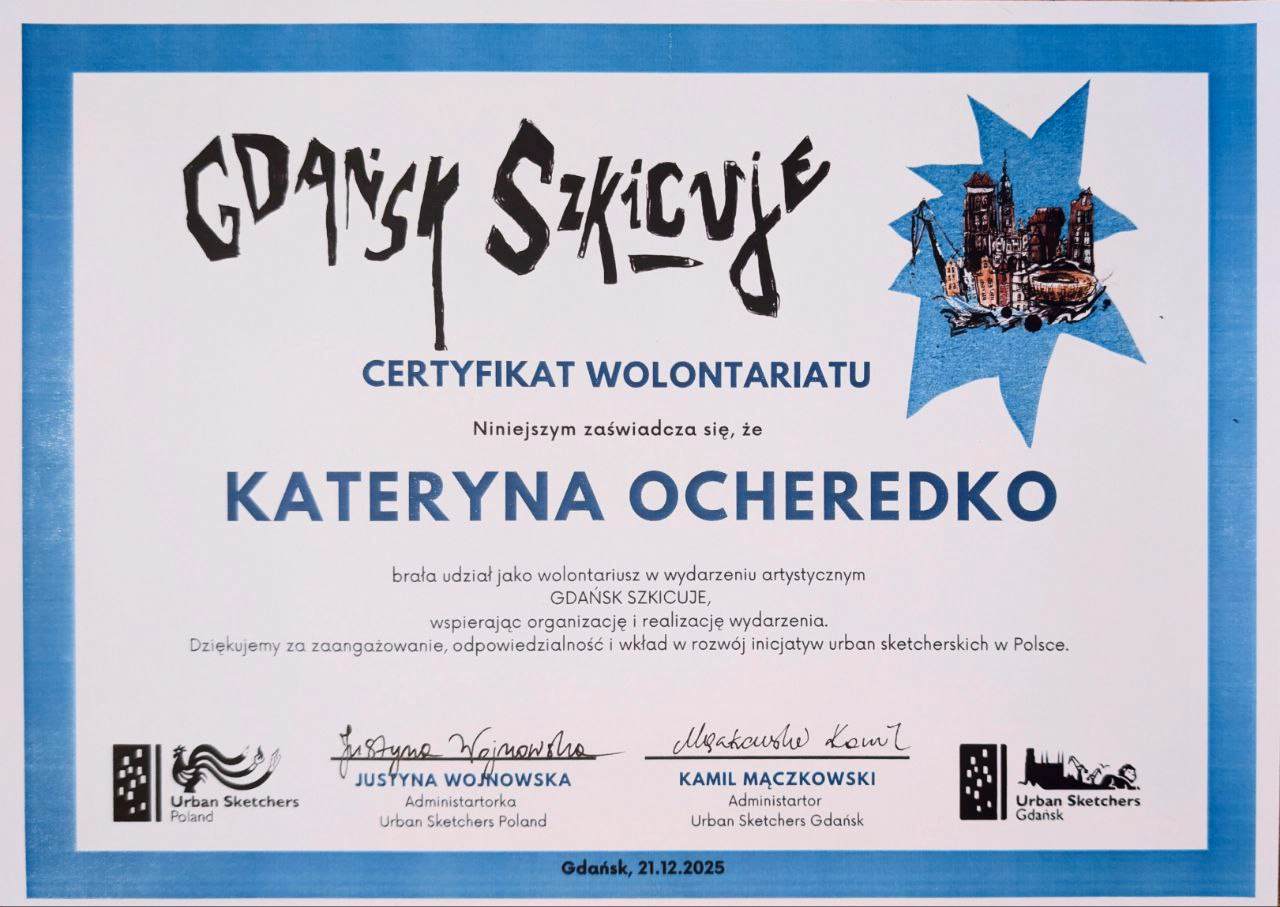 15 of our works were selected for the exhibition of sketches dedicated to Gdańsk. At our artist booth, we displayed sketches, sketchbooks, postcards, and posters. During the event, we also served as volunteers, which was a valuable and inspiring experience for us.