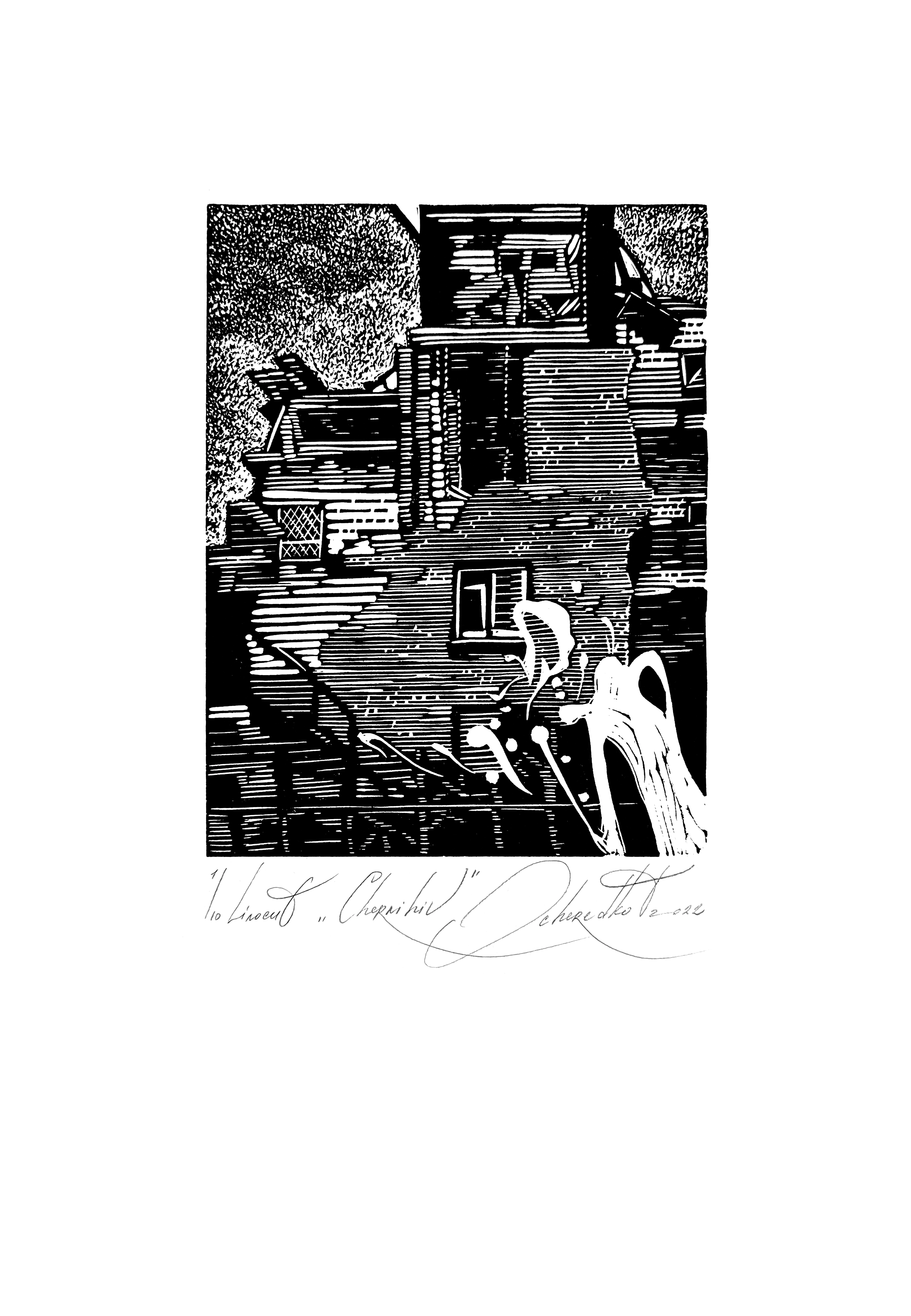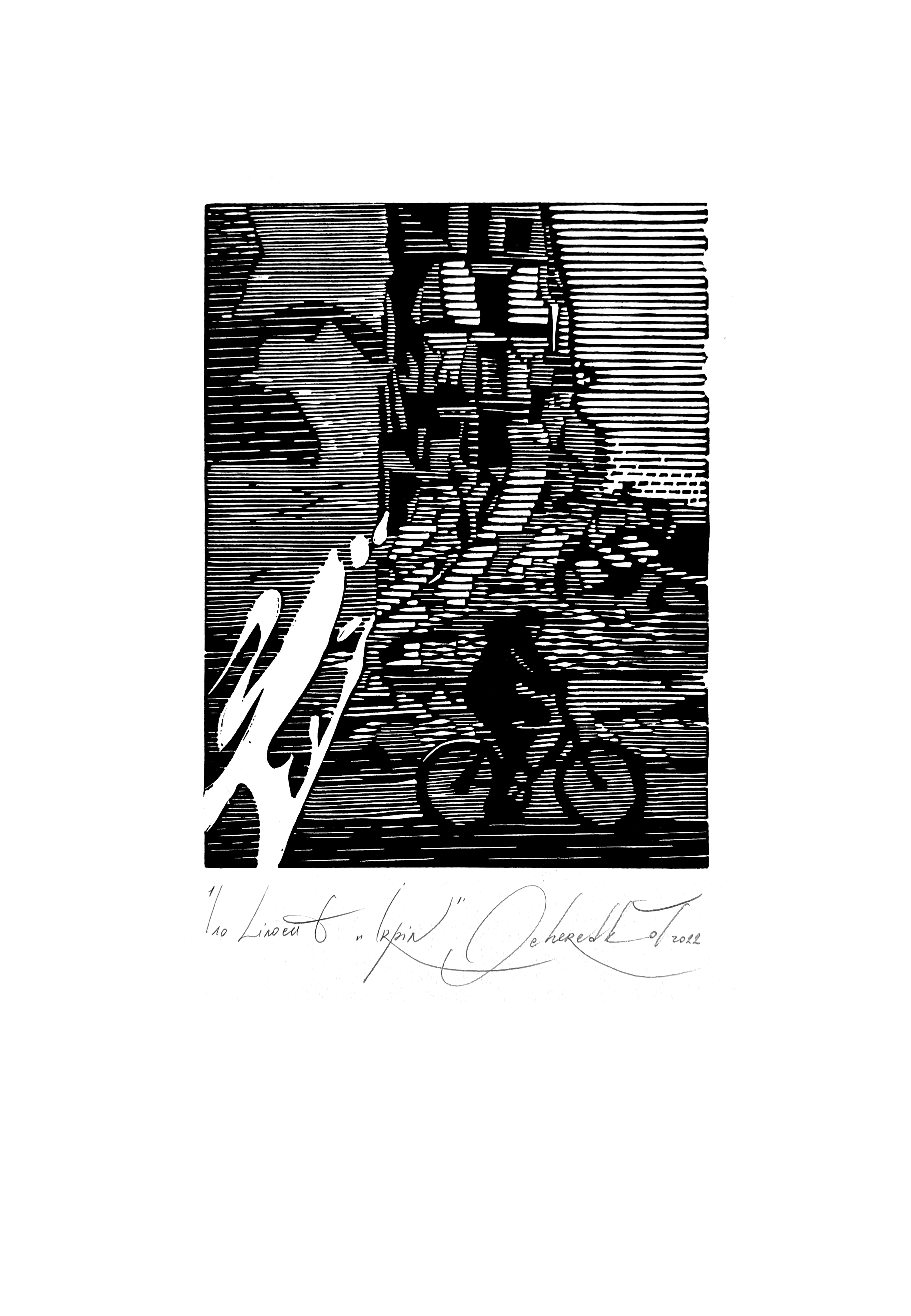 In her works, Tetiana depicted the destruction experienced by Kyiv, Kharkiv, Chernihiv, Irpin, Mariupol, and other cities of Ukraine. Landscape is a central motif in Tetiana’s art: a somewhat geometric and restrained treatment of form is combined with expressive white areas.
