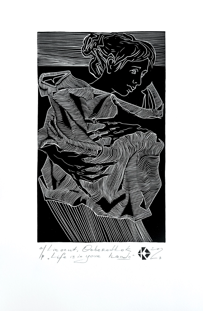 “Życie jest w twoich rękach”, 2023, linoryt, format pracy 25×15 cm, format papieru 39×27 cm, Kateryna Ocheredko